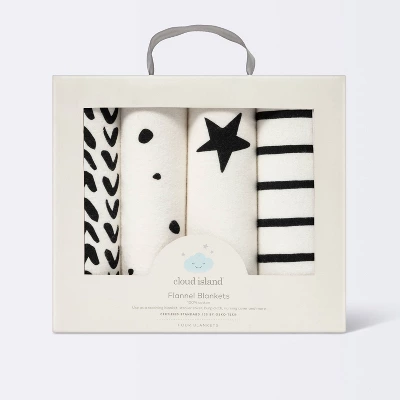 Keep your little one snuggled in this 4-Pack Flannel Baby Blankets from cloud island™. This pack of black and white flannel blankets makes a cozy and practical addition to your baby’s everyday essentials. It includes four blankets featuring a mix of stars, stripes, dots and botanical patterns to add fun variety to their nursery decor. The 100% brushed cotton material is soft and gentle on baby skin, and keeps them warm and comfortable. Whether you use them for swaddling, as receiving blankets, stroller covers or nursing covers, they’re great for versatile day-to-day use.